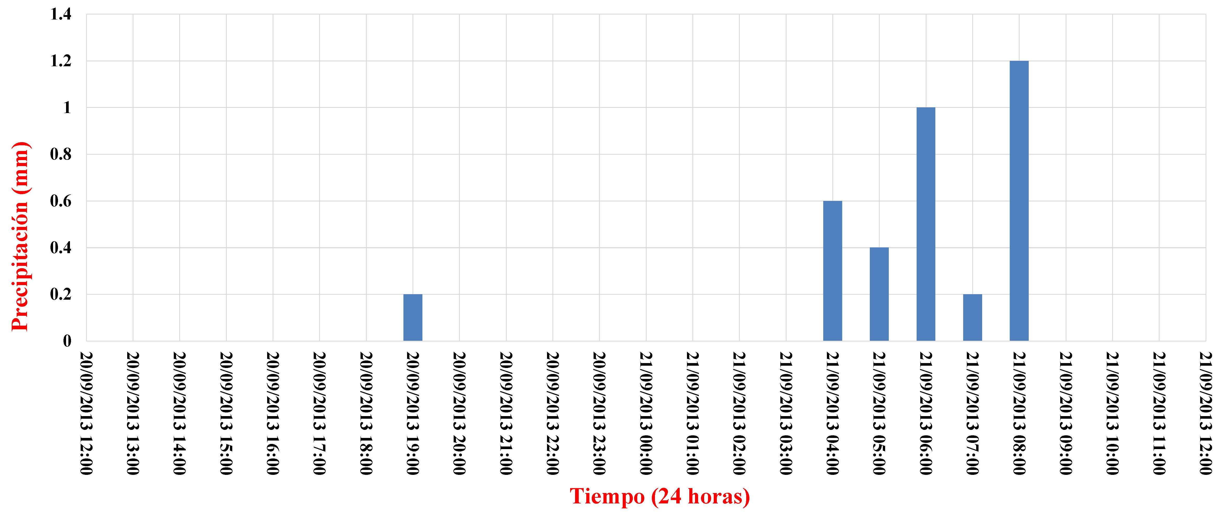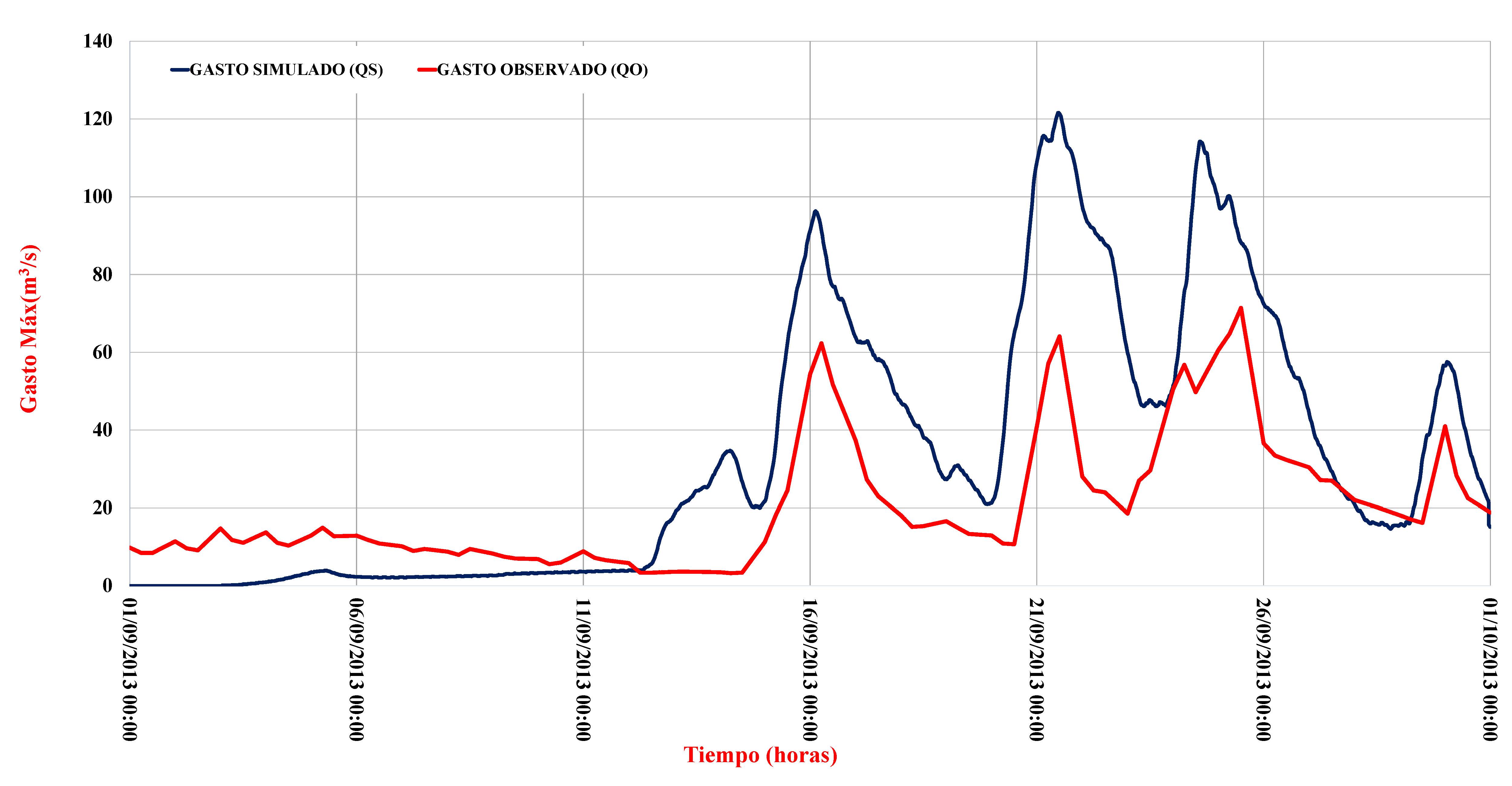 La modelación hidrológica se realizó con HEC-HMS, considerando las características de las subcuencas como área, tiempo de retraso y valores de curvas de escurrimientos. Las precipitaciones se incorporaron mediante hietogramas para septiembre de 2013. Se calibró el modelo, tomando como base un hidrograma aforado a la salida de la cuenca y adecuando valores de curva número de escurrimientos hasta tener un ajuste aceptable entre el hidrograma calculado por el modelo y el aforado a la salida de la cuenca; el ajuste se evaluó mediante los criterios de Nash-Sutcliffe, RMSE y el coeficiente de determinación.