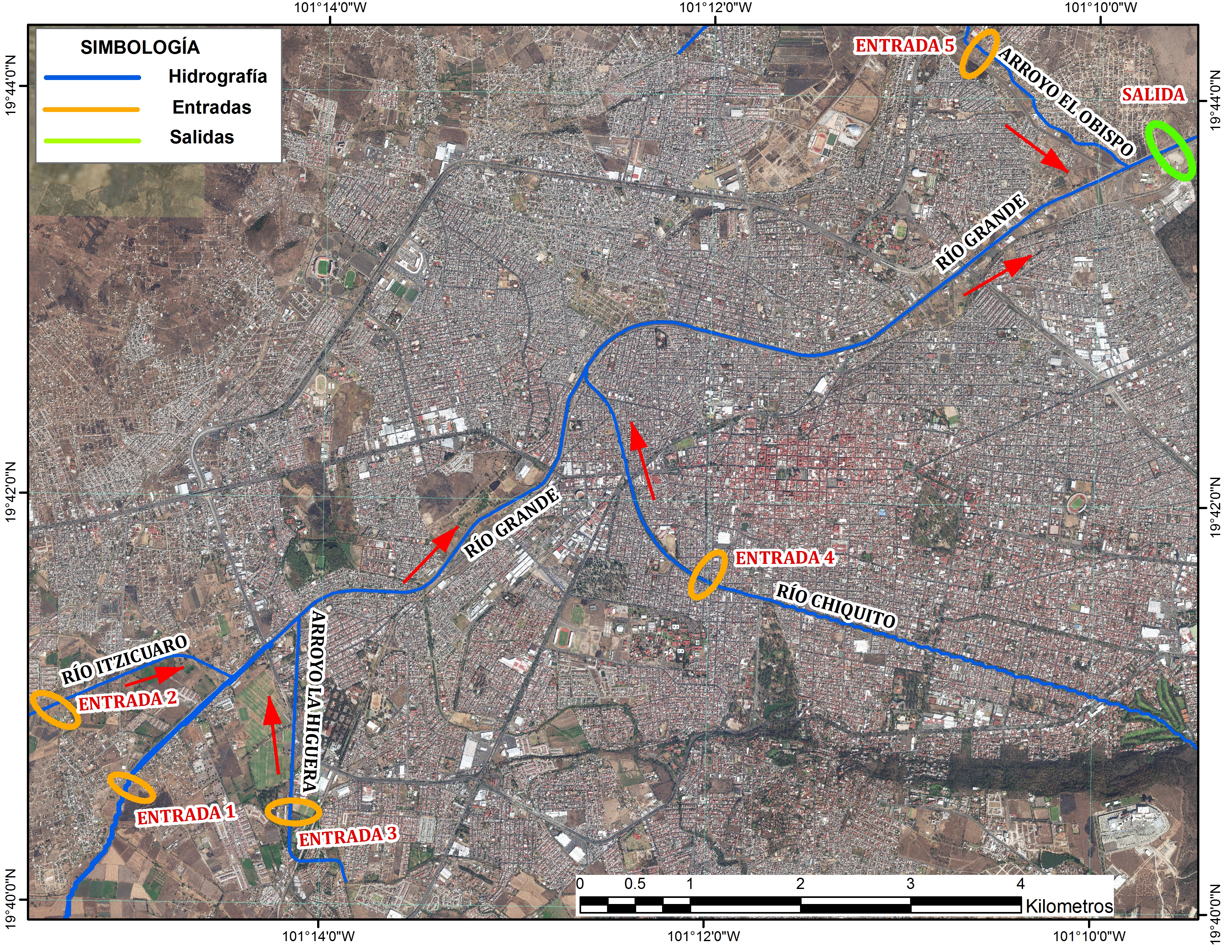 Se determinaron áreas vulnerables a inundaciones en la ciudad de Morelia Michoacán, causadas por el rÃo Grande de Morelia que la cruza; esto, mediante la aplicación de un modelo hidrológico en su cuenca hidrológica y otro hidráulico sobre el rÃo, en su tramo por la ciudad.