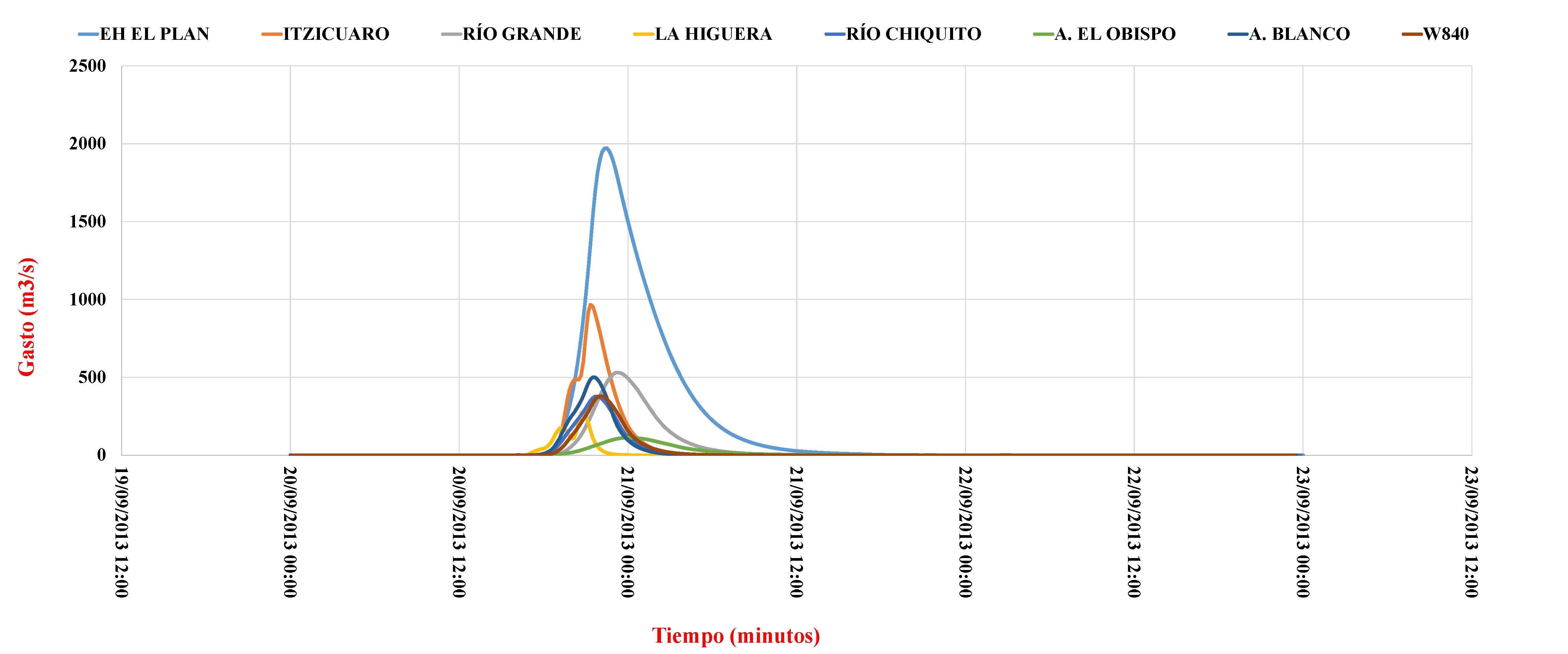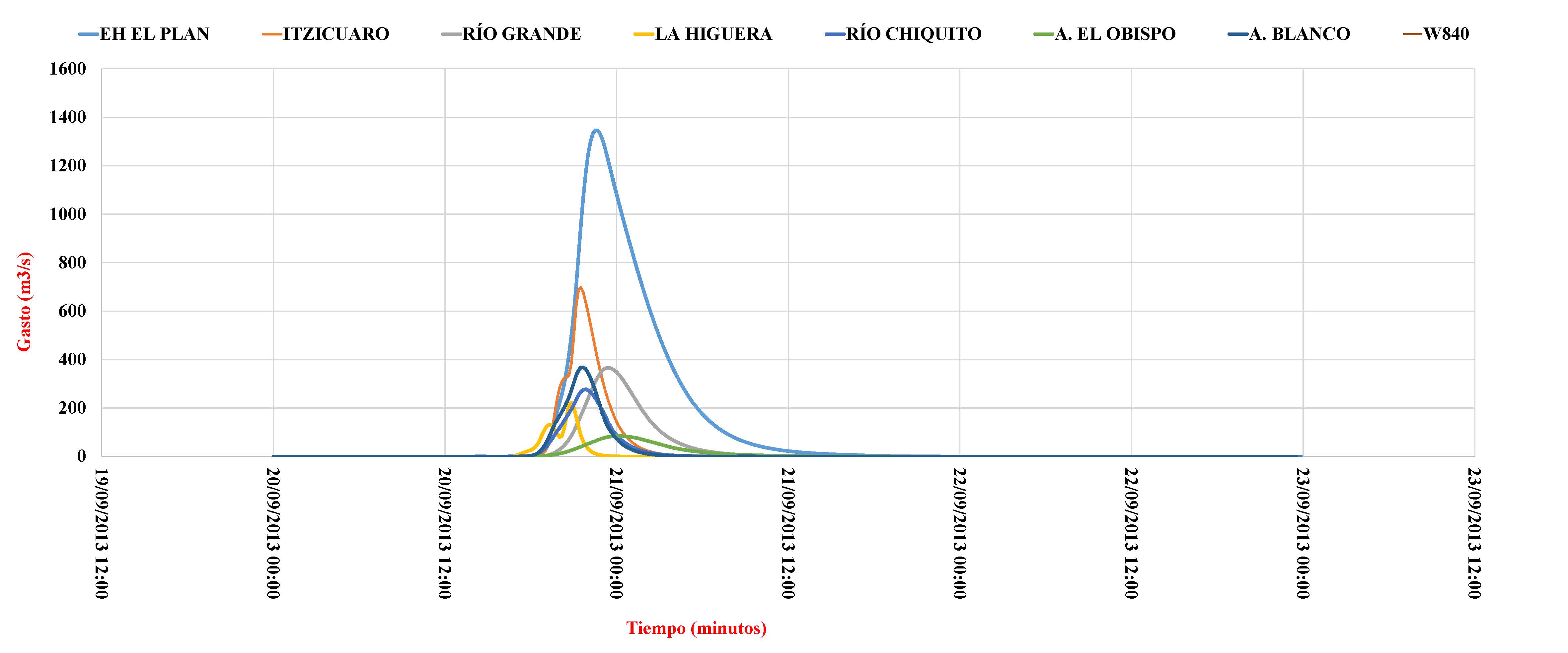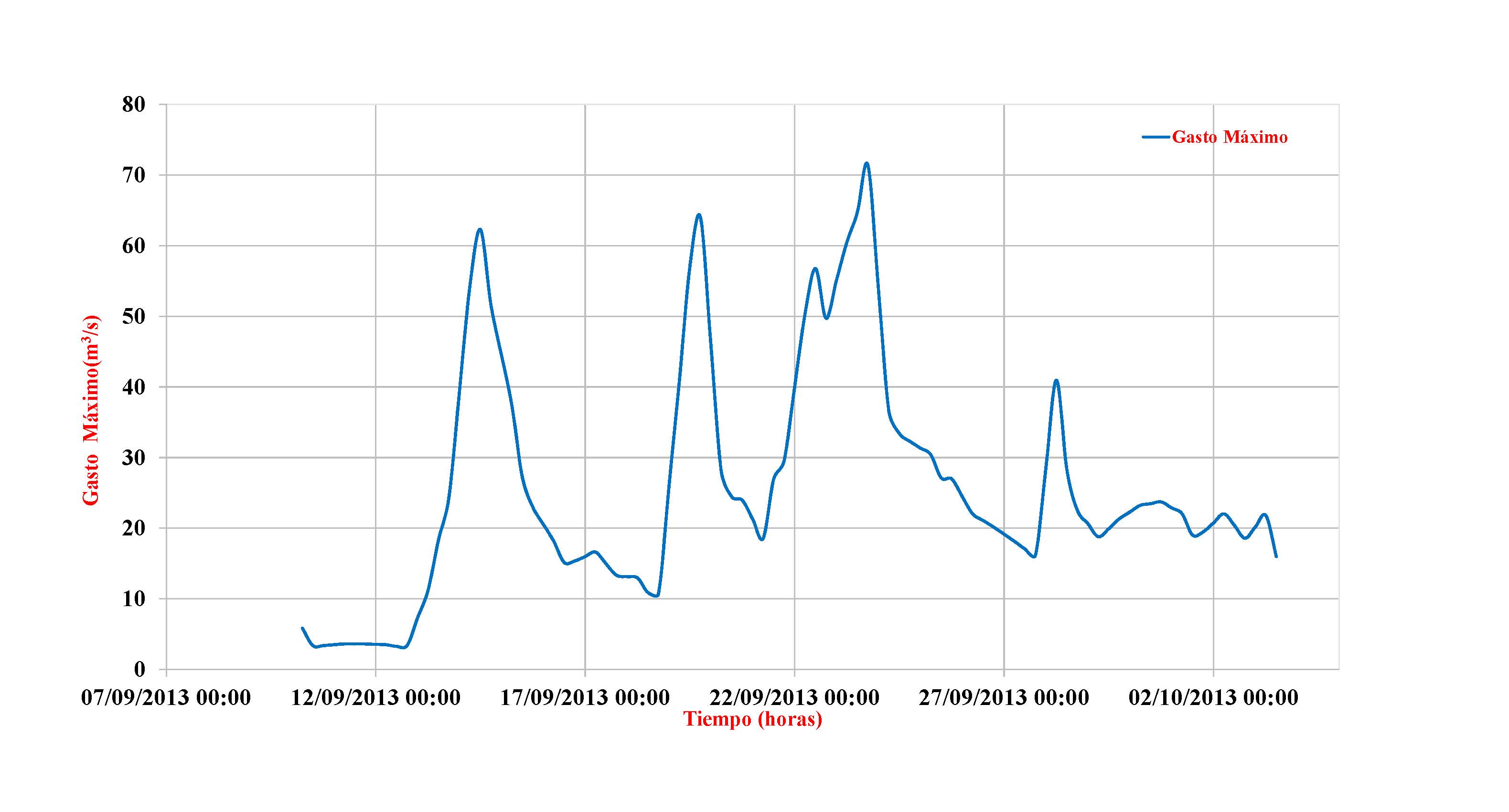 Con el modelo hidrológico calibrado, se identificó un evento con duración de 24 horas y se sustituyeron las precipitaciones por hietogramas asociados con los periodos de retorno de 100 y 500 años, que se estimaron mediante la función de distribución de probabilidad Gumbel; se modelaron ambos eventos y se obtuvieron hidrogramas.
